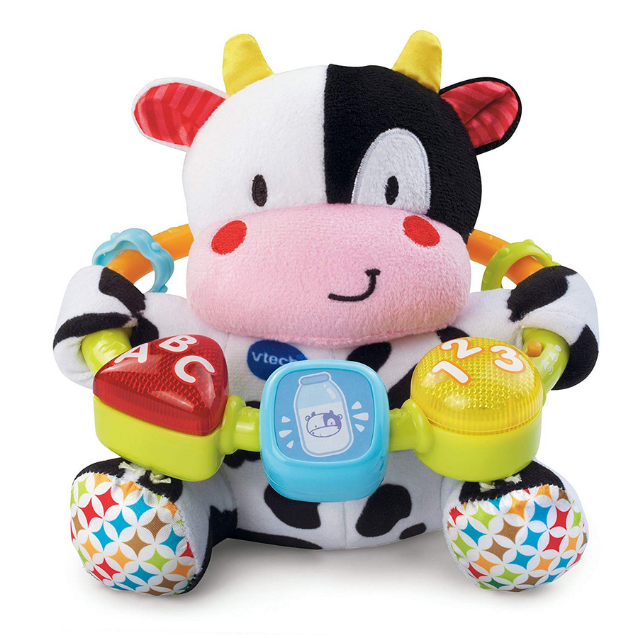 - Musical baby toy features a variety of fabric textures for baby tactile development; cuddle up with the soft cuddly stuffed animal cow