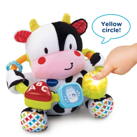Cuddle and learn with the Lil' critters musical beads by VTech. Press the light-up buttons or spin the square bead to hear cheerful songs and phrases that teach shapes, colors, numbers and letters. The plush cow features a variety of fabric textures to develop tactile awareness, and the easy-to-grasp ring strengthens motor skills. Your little one will have a musical good time.
