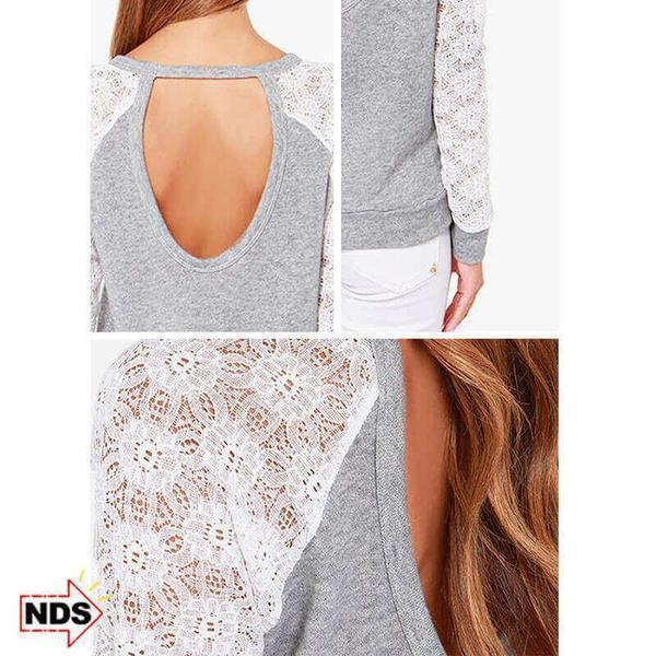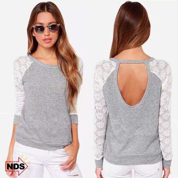 Loose casual crew neck top with contrasting long lace sleeves and cut out back design A chic basic staple for your everyday wardrobe! Wear with jeans and sneakers for an off-duty look.